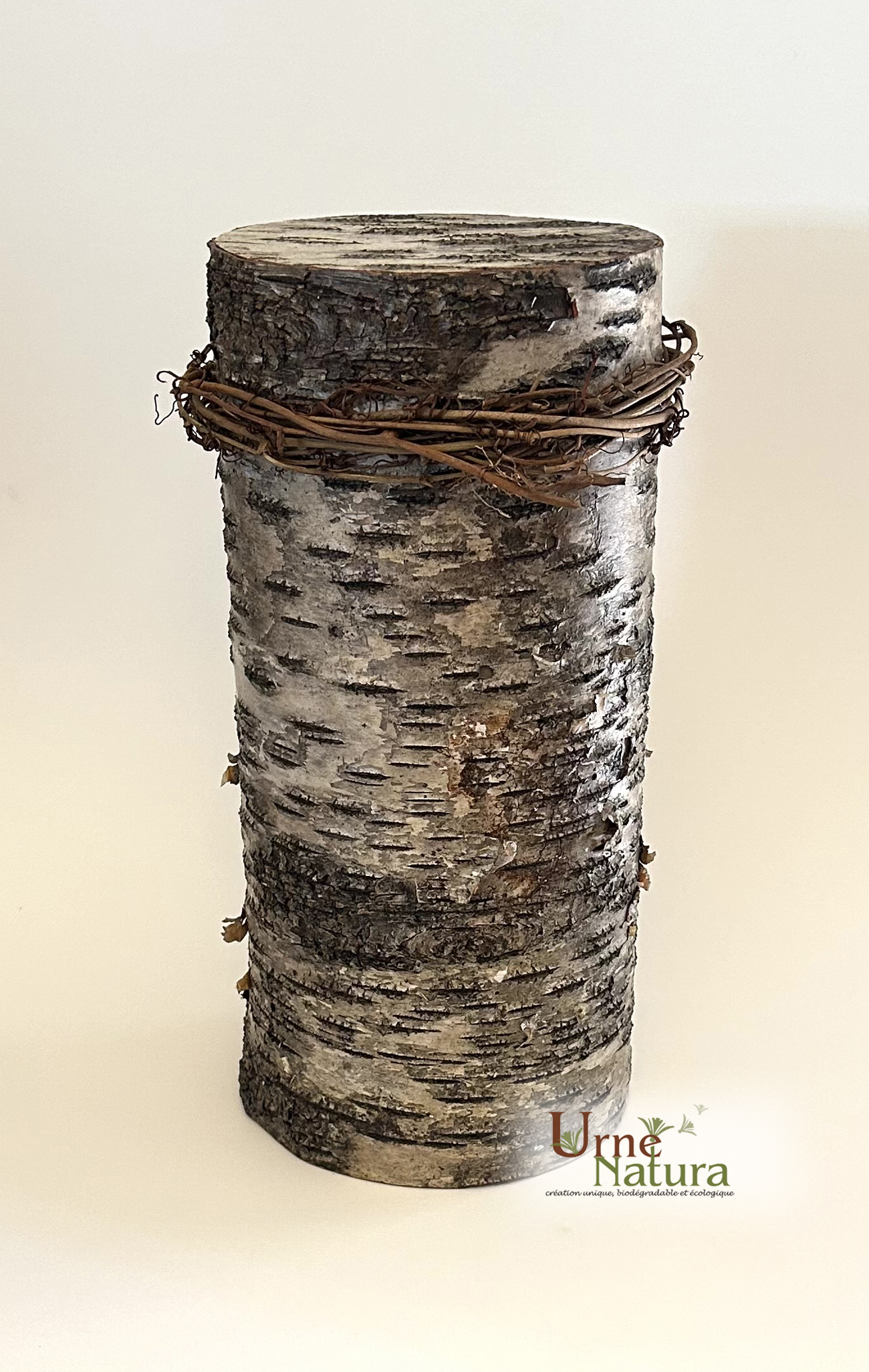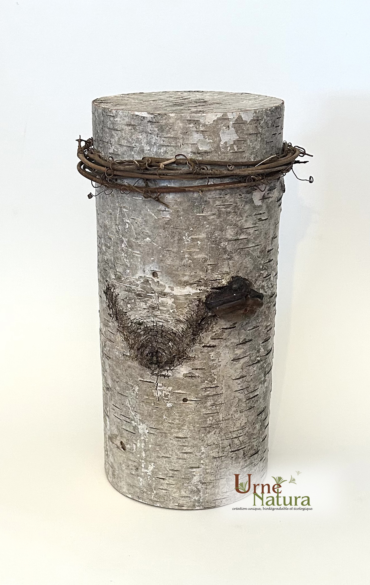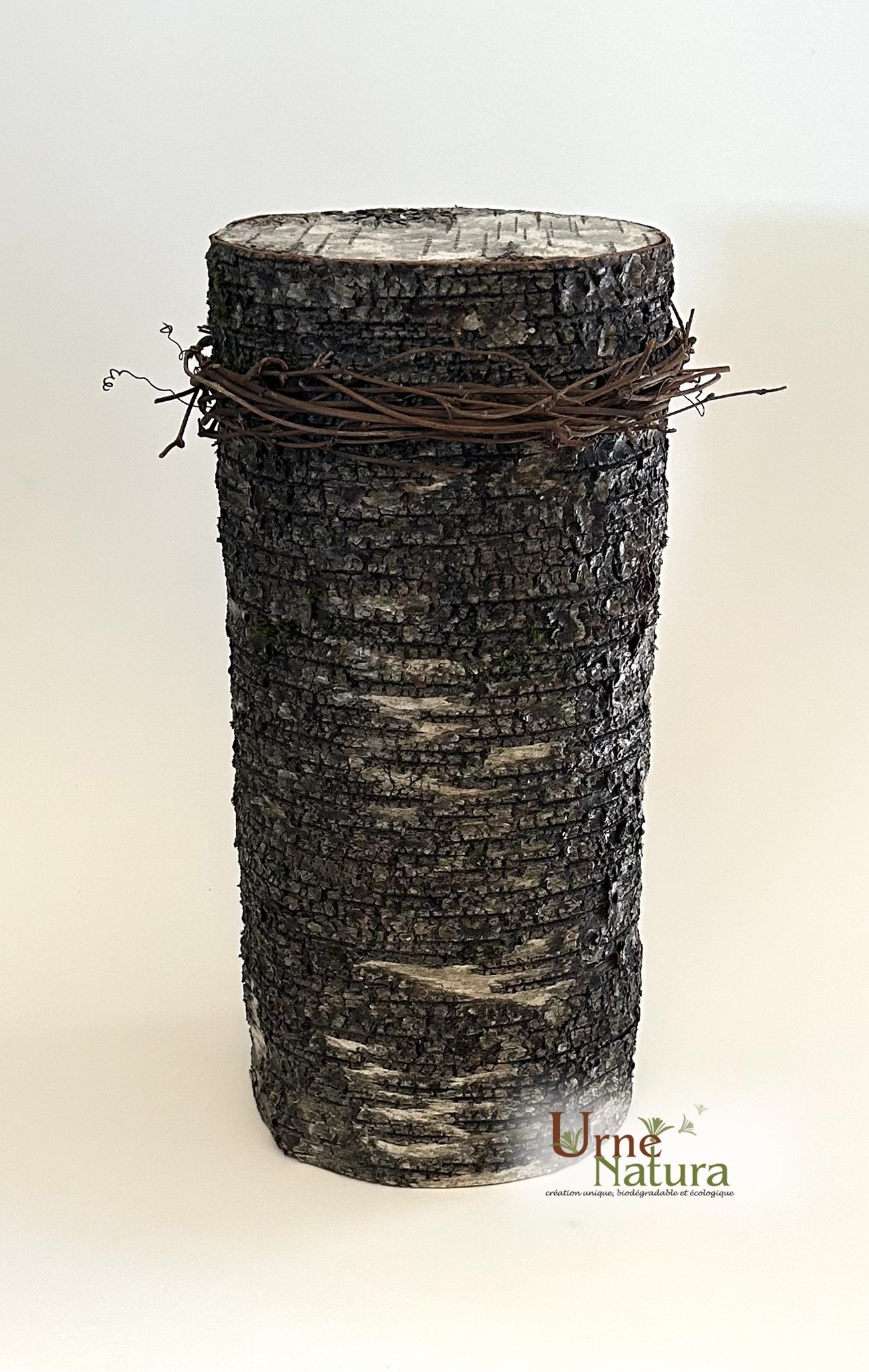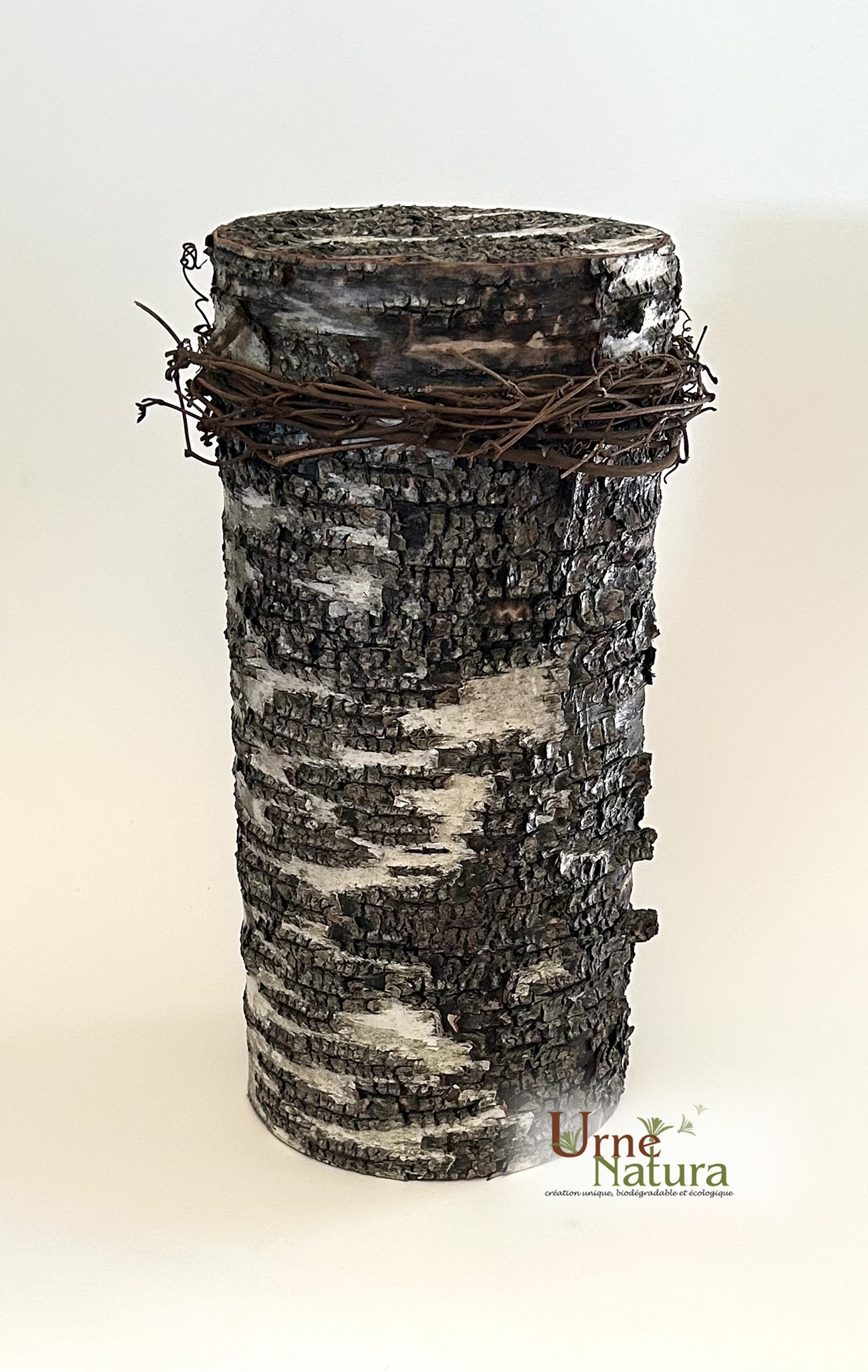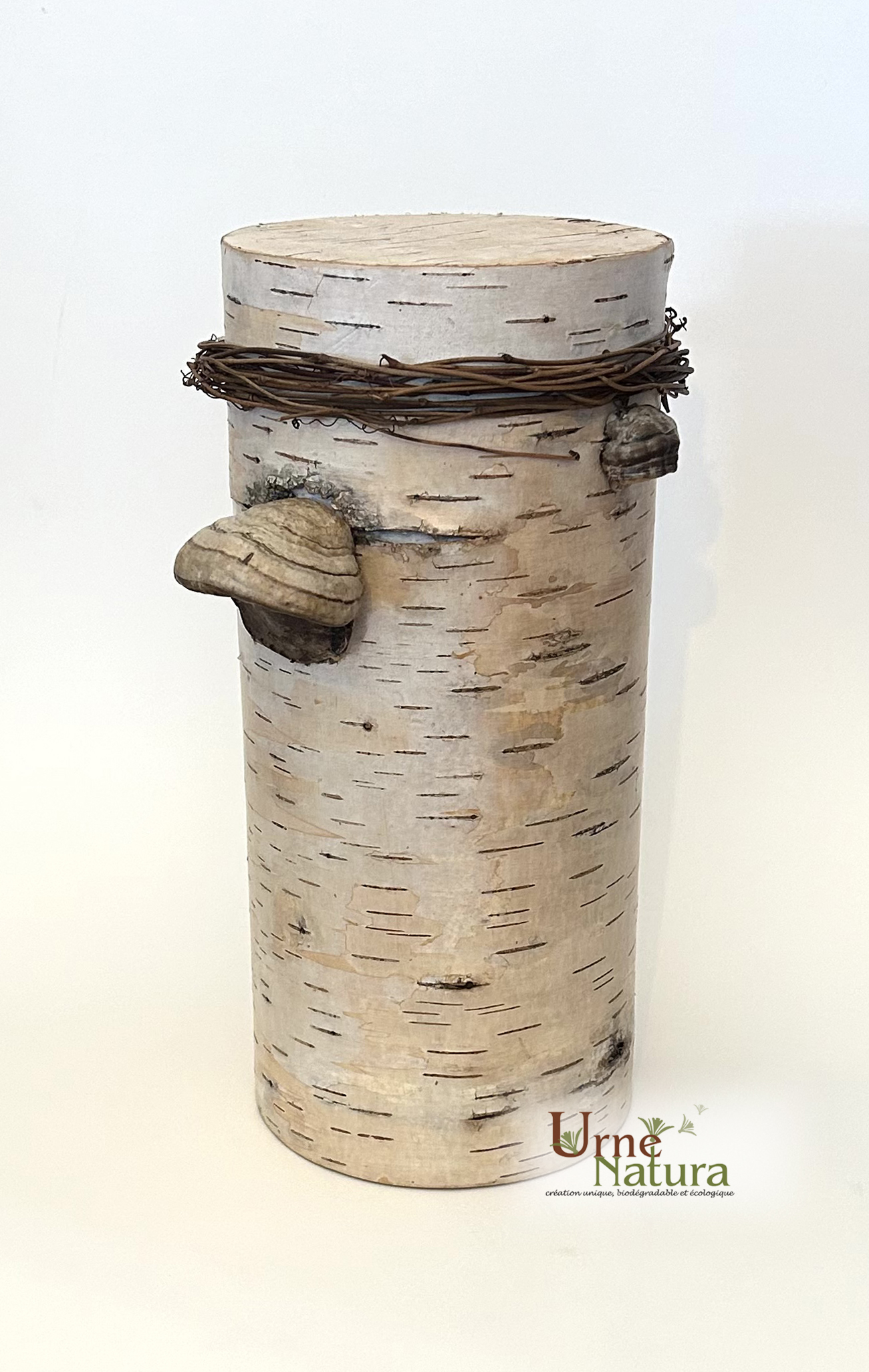 Urne de vie entièrement écologique et biodégradable composée de carton, de champignons, de mousses, de lichens, de vignes et d’écorces.